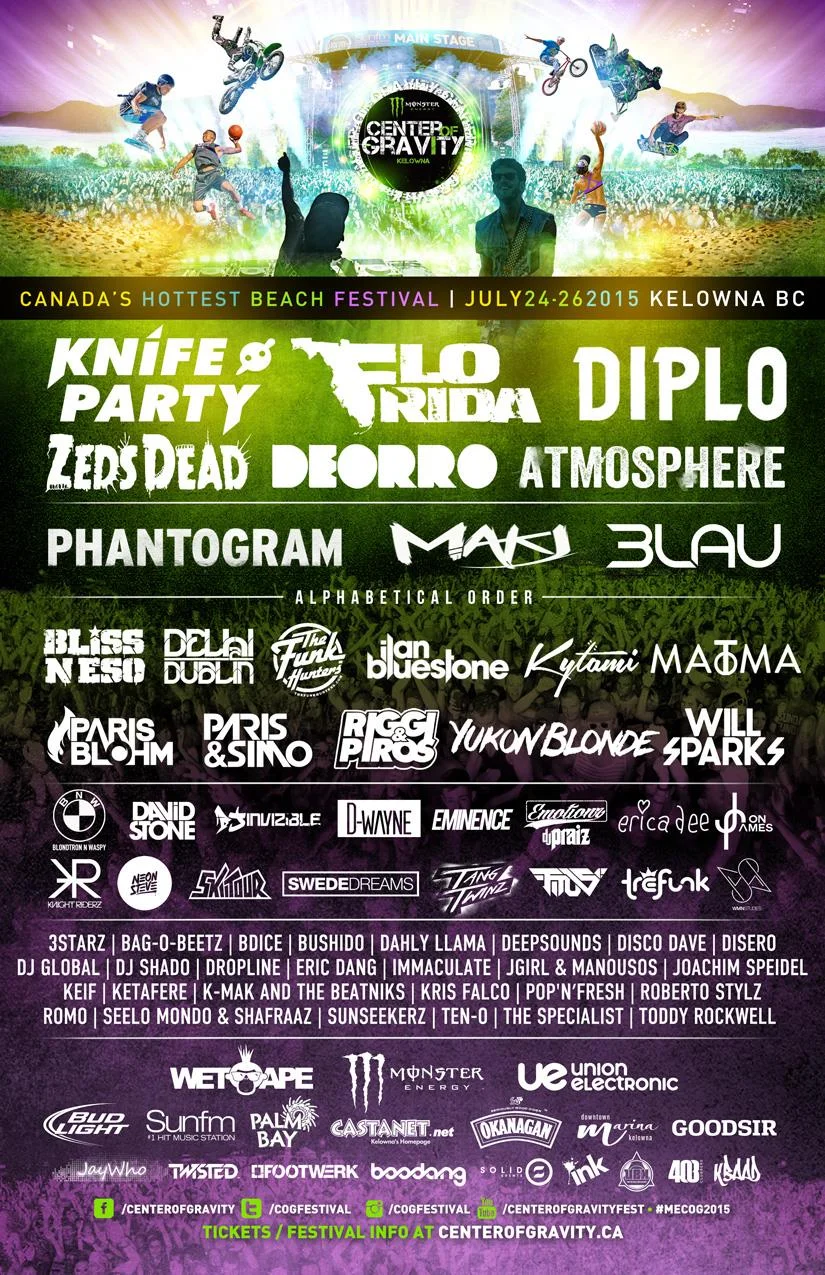 Overview: Billed as Canada's hottest beach festival, the 2015 edition features an electronic heavy lineup with Knife Party, Diplo, and Zeds Dead headlining. Center of Gravity is one of the more festivals in Canada as they combine extreme sports with a large dose of electronic dance music.